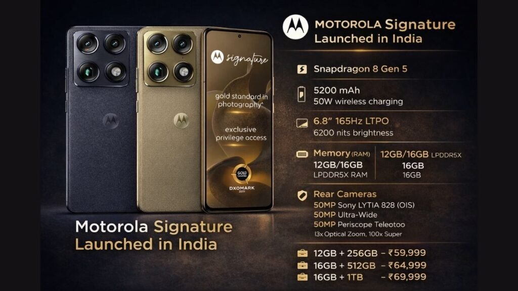 मोटोरोला सिग्नेचर (Motorola Signature) एक नया स्मार्टफोन है जो 2026 में लॉन्च हुआ है। यह मोटोरोला की नई सिग्नेचर सीरीज का पहला फोन है। अगर आप एक प्रीमियम फोन ढूंढ रहे हैं जो कैमरा, बैटरी और डिजाइन में सबसे बेहतर हो, तो यह आपके लिए परफेक्ट चॉइस हो सकता है। इस आर्टिकल में हम इस फोन के बारे में सरल भाषा में बताएंगे। हम फीचर्स, कीमत, कैमरा और बहुत कुछ कवर करेंगे। अगर आप “Motorola Signature फीचर्स” या “Motorola Signature कीमत भारत में” सर्च कर रहे हैं, तो यहां सब कुछ मिलेगा।